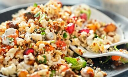 Bloemkoolrijstsalade met fetakaas, munt en granaatappelpitjes |